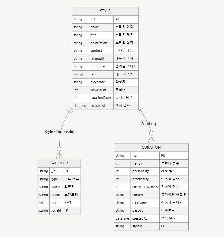 우리 팀은 PostgreSQL과 MongoDB방식 중 연습 차원에서 MongoDB를 채택하기로 하였다.기본적으로 ESM형식을 기반으로 코드를 작성 그러기 위해 package.json에"type": "module",을 작성 앞서 개별적으로 배운 내용을 활용하고자 Mermaid ERDiagram을 작성해보았고파일 구성 Tree는 팀원의 노션 내 ReadME파일을 따랐다. erDiagramerDiagram STYLE { string _id "PK" string name "스타일 이름" string title "스타일 제목" string description "스타일 설명" string content "스타일 내용" string i..